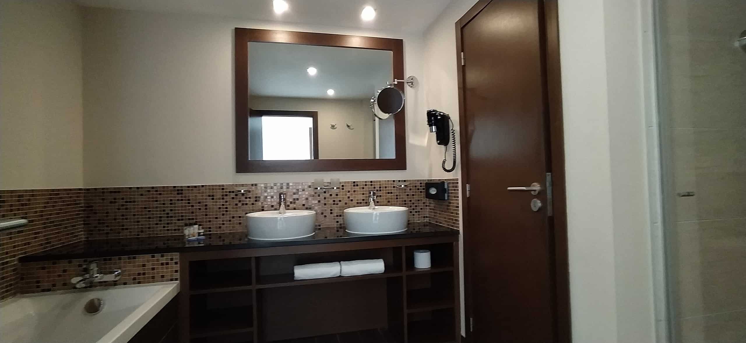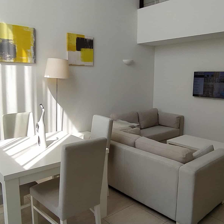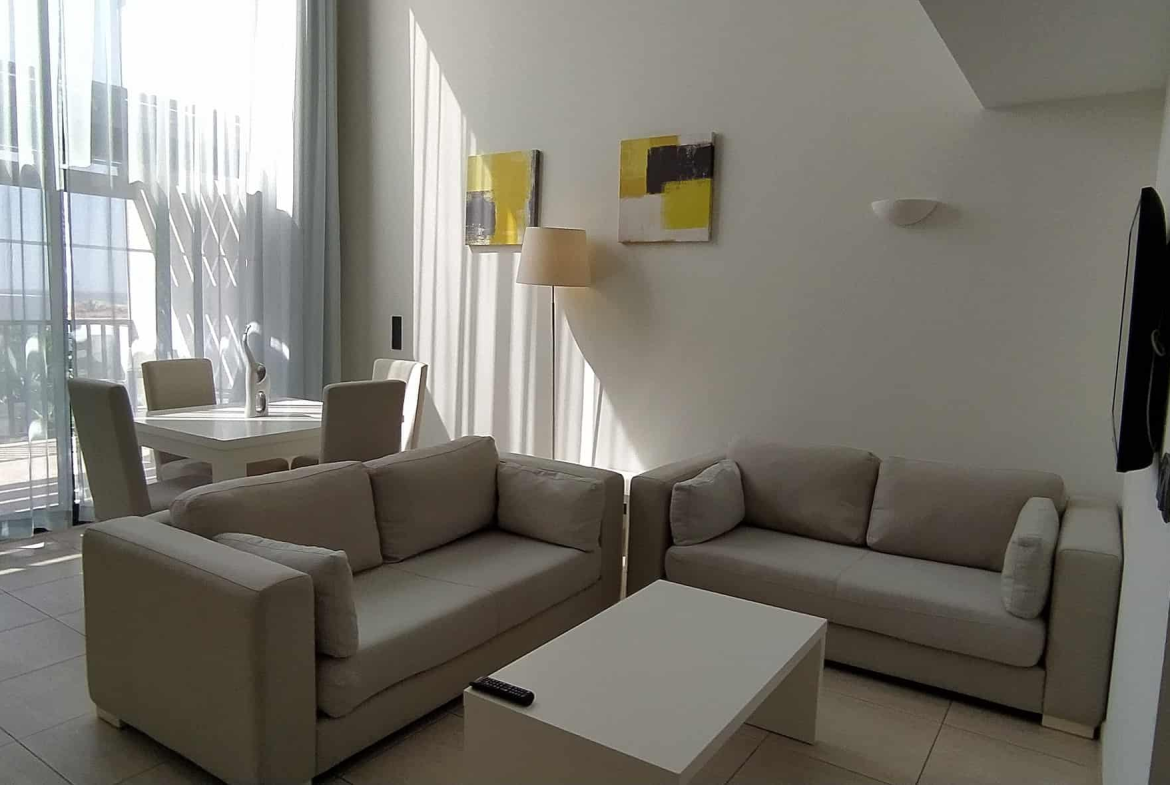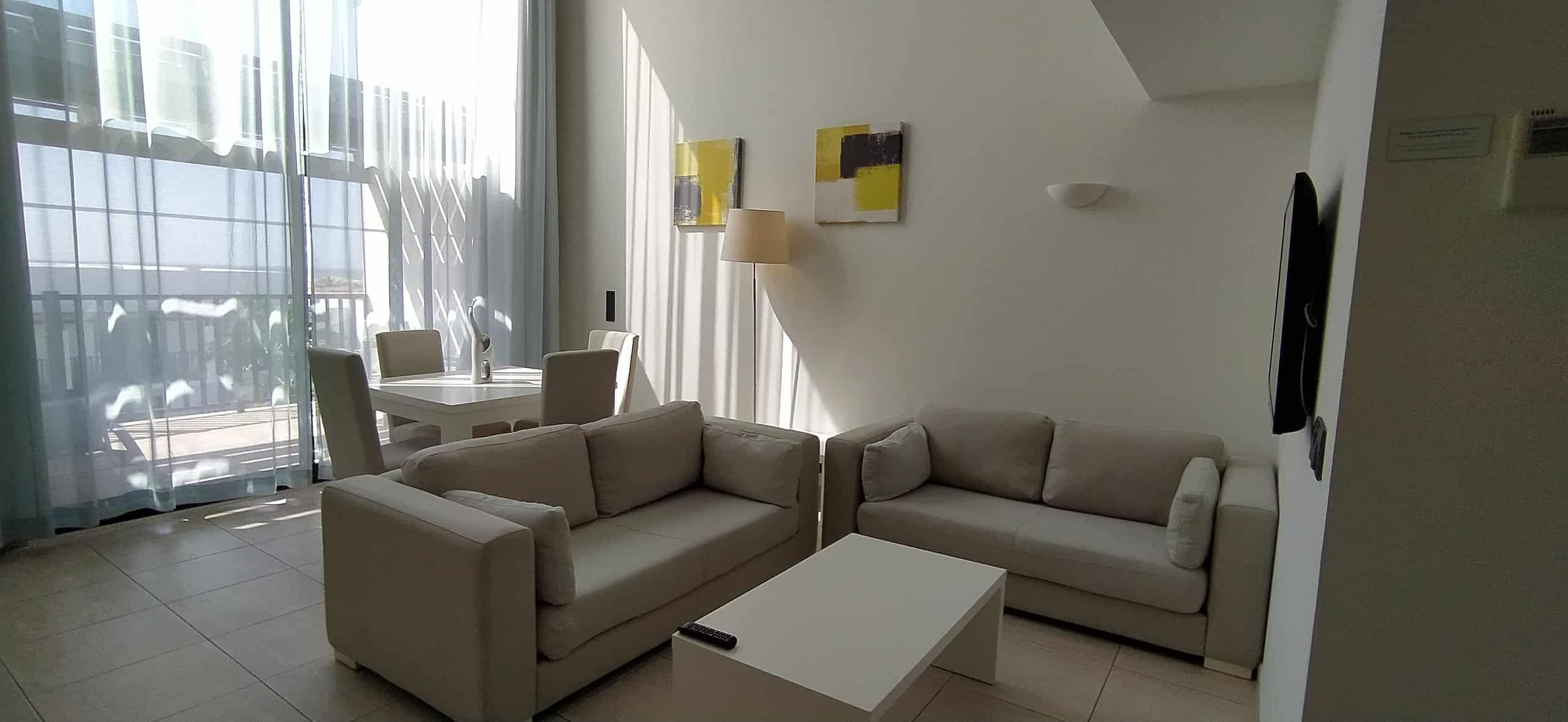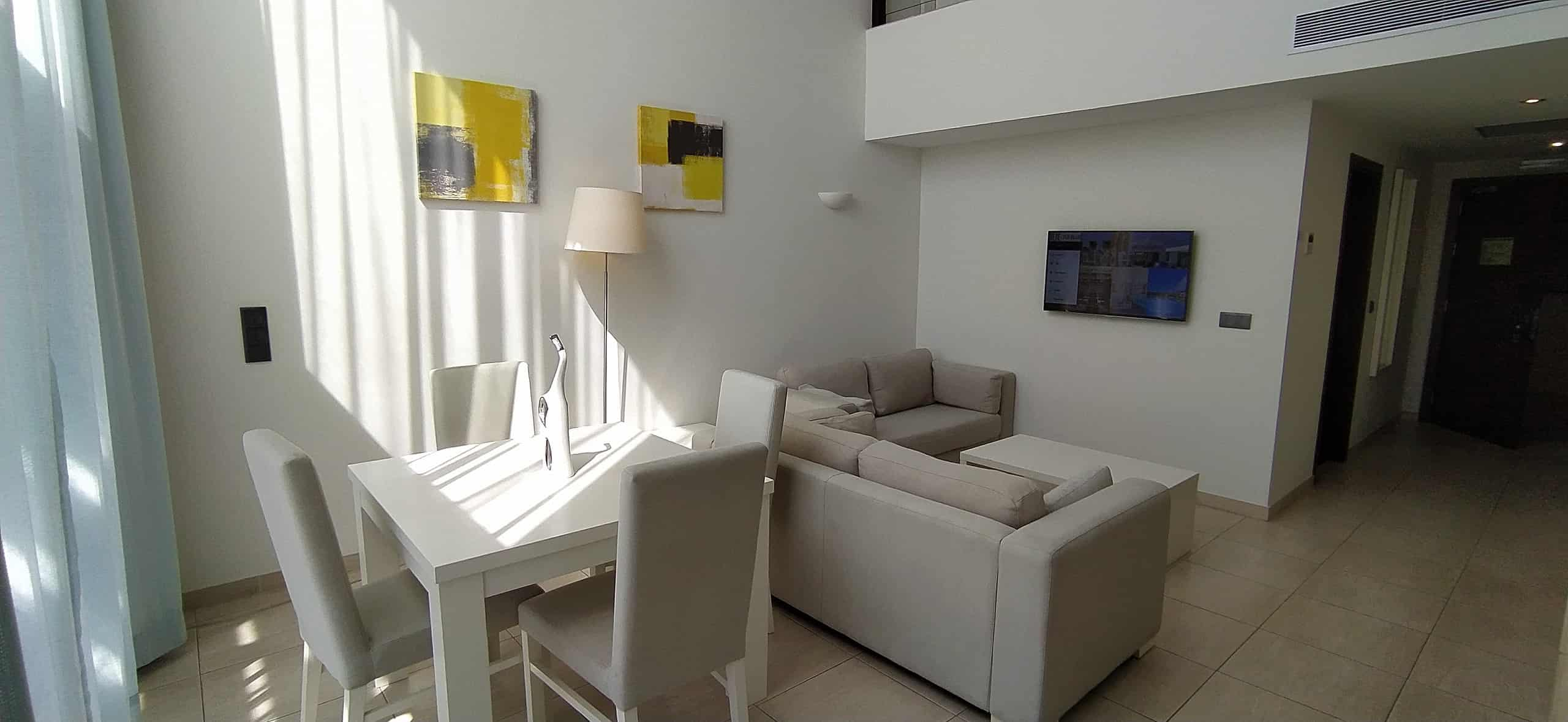 Unlike standard resort apartments, this duplex suite benefits from double-height windows, which flood the living space with natural light. As a result, the open-plan living and dining area feels bright, airy, and welcoming throughout the day.