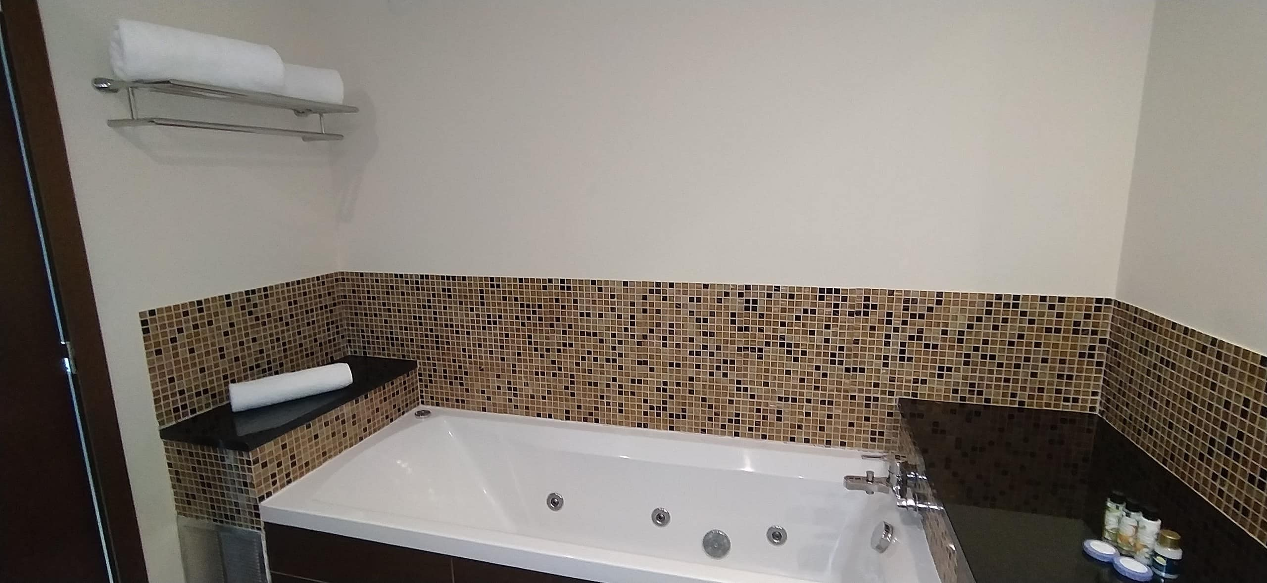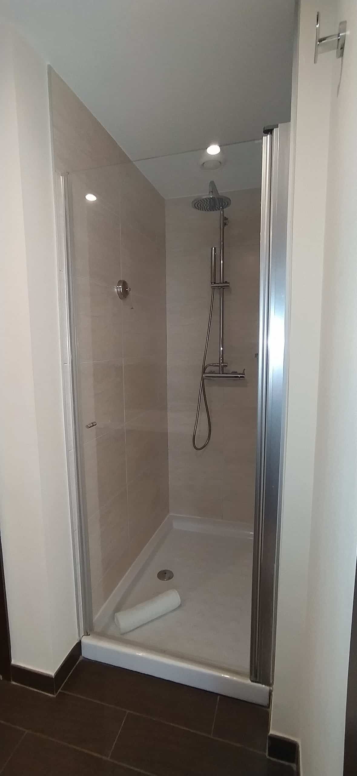 A spiral staircase leads to the mezzanine level, where the bedroom overlooks the living space below. Consequently, the suite maintains an open, modern feel while still offering privacy and comfort.